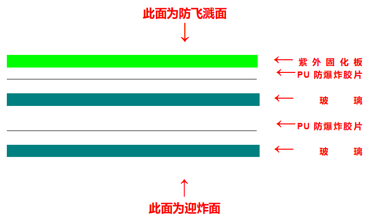 þ 材料:由2层防火玻璃,2层PU防爆炸胶片,1层紫外固化板结合而成。